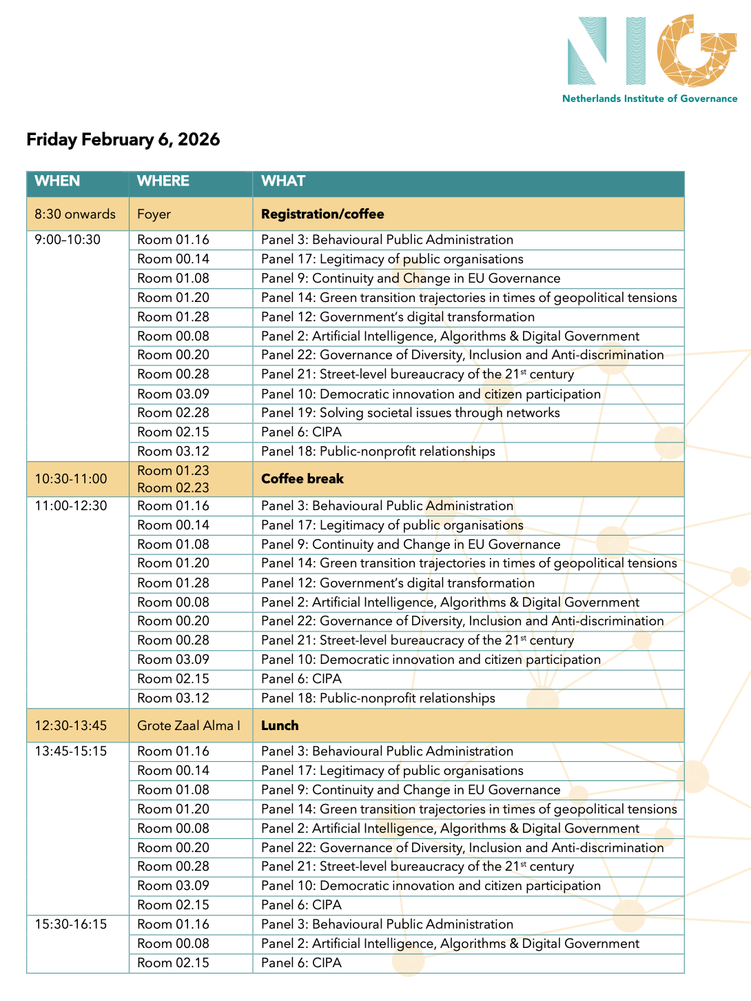 The NIG conference aspires to simultaneously be a 1) high quality academic conference, 2) as well as a warm network event for the (open) research community around public governance in the Netherlands and Flanders, and also 3) an accessible event where our PhD candidates feel encouraged to present early work.